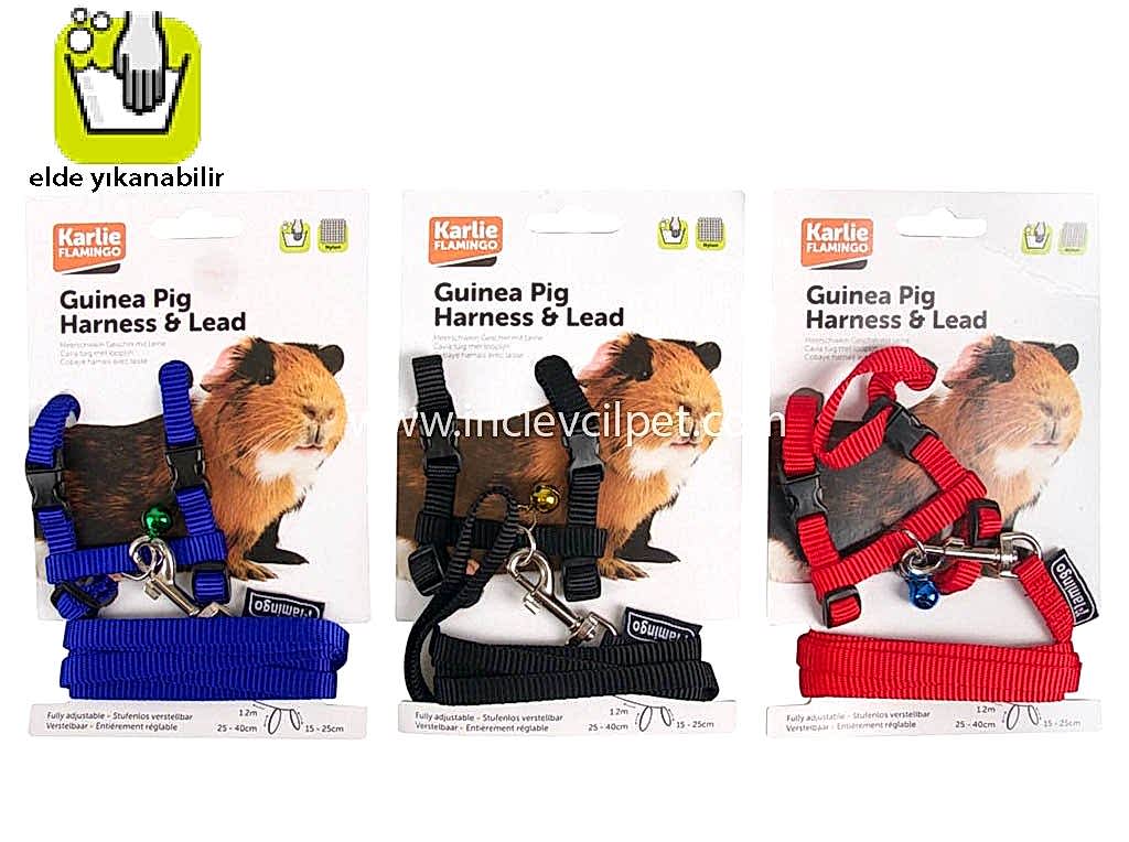 Gine pigler için tasma ve uzatma. Uzunluk: 120 cm. 15-25 cm çap. Kırmızı, siyah ve mavi renk çeşitleriyle.