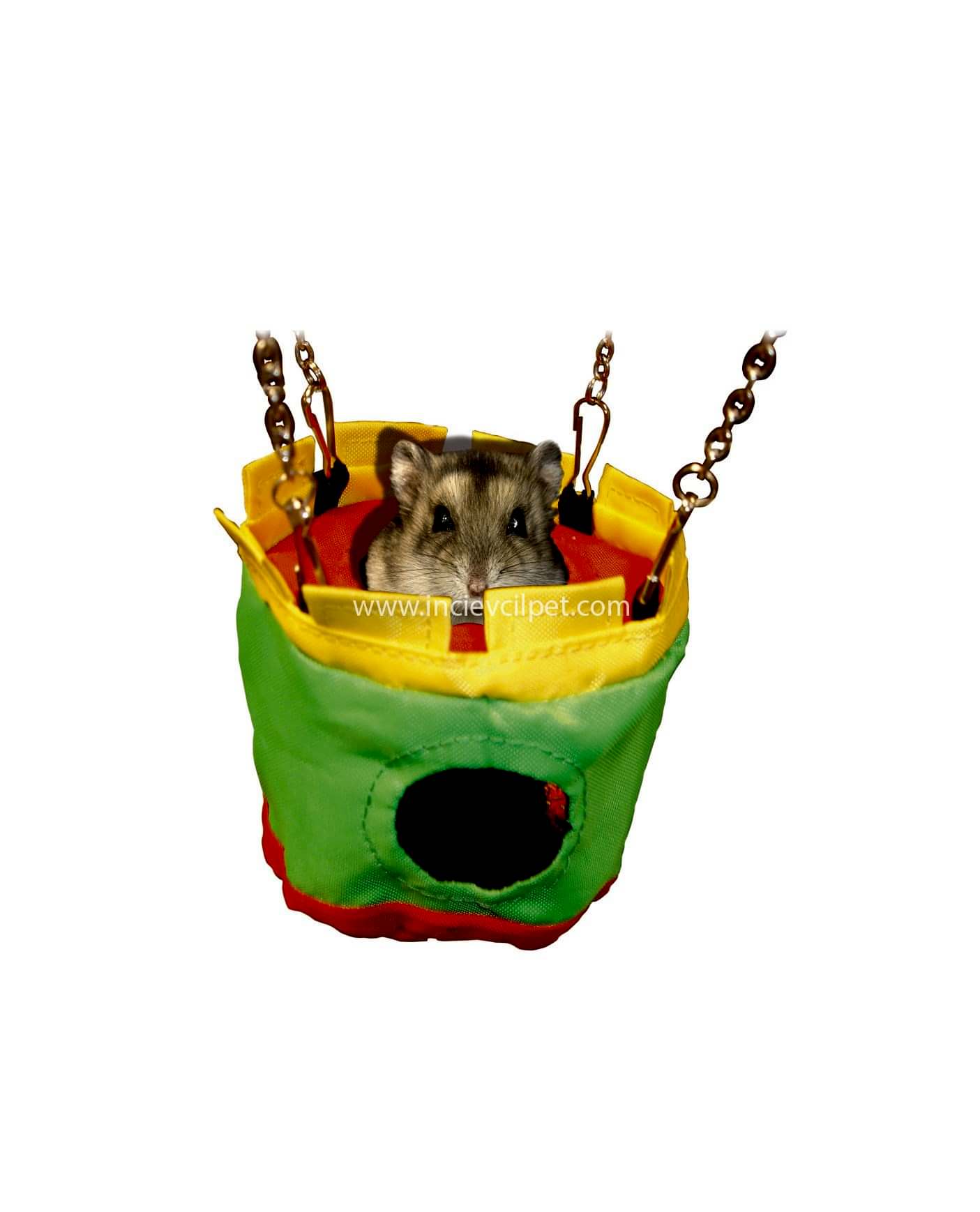 Dayanıklı naylondan yapılmış renkli hamster evi küçük bir kaleye benziyor. Bağlı zincirler ve kelepçelerle kafesin içine kolayca sabitlenebilir. Evin kafes tabanına temas etmemesi gereklidir. Kemirgene çekicilik ayratması için hışırtılı bir kumaş yapısına sahiptir. 25 cm uzunluk, 10 cm çap. Karışık renkli.