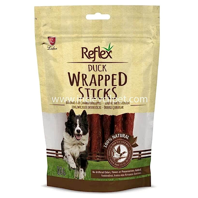 Köpekler için, doğal, ördek eti ve morina balığı eti ile hazırlanmış % 90 et içeren yumuşak dilim şeklinde köpek ödülü. Parlak tüyler için gerekli yağ asitleri içerir.